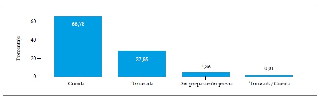 En la investigación realizada por Fernández, Minayay Palomino (2015), el 46 % de las personas prefierenhervir las plantas medicinales, el 34 % las consumecrudas, el 15 % reposando y sólo el 5 % en infusión, resultados similares se obtuvieron en la presente investigación donde la mayoría de los tratamientosson preparados en forma de cocción (66,78 %) y triturado (27,9) (figura 5).