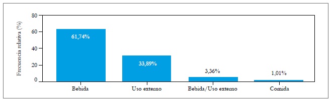 La vía de administración más empleada para el consumo de las plantas medicinales fue bebida (61,7 %) y uso externo (33,9), como se ve en la figura 6.Estos resultados son similares a los expuestos por Domínguez, Cruz y González (2015), donde el 67,5 % de las plantas son preparadas como bebida e ingeridas de esta manera.