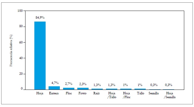 Las hojas son la parte de la planta que más se emplea en la preparación de tratamientos medicinales y representan el 84,9 % del total de estructuras usadas para ese fin (figura 7); resultados similares se obtuvieron en la investigación de Domínguez et al. (2015), en la que se indica que la hoja es usada con más frecuencia en la preparación de tratamientos medicinales (54,1 %), seguida de la raíz (10,2 %), a diferencia de la investigación realizada por Fernández, Minaya y Palomino (2015), en la que el 61 % de los entrevistados prefiere usar el fruto y el 23 % usa las hojas.