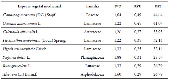 En la tabla 6, se describen las especies vegetales de uso medicinal con un ust superior al 20 %: C. citratus (44,64), O. americanum (41,07), C. officinalis (33,93), P. amboinicus (32,14), H. actinocephala (32,14), S. dulcis (28,57), R. graveolens (26,79) y A. vera (26,79).