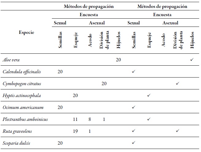Las especies utilizadas para la determinación e identificación de métodos de propagación se seleccionaron mediante el empleo del listado de especies con mayor ivu y rvu. Se elaboró una segunda encuesta, con el fin de identificar los métodos y procesos de propagación de plantas medicinales, y se aplicó a 20 habitantes de la zona del bosque protector Murocomba y su área de influencia, donde se consideraron las siguientes variables: importancia de la propagación y conservación, método empleado (sexual o asexual), reproducción por semilla, reproducción vegetativa (esquejes, acodos división de plantas, e hijuelos), tiempo de reproducción, área de propagación (maceta, contenedor, funda o suelo directo), tratamientos pregerminativos y motivo de propagar las plantas medicinales.