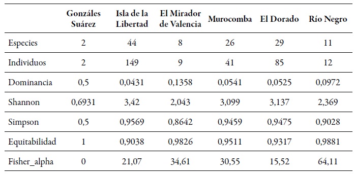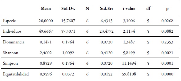 La prueba de separación de medias t de student (tabla 5) en las seis localidades del bosque protector Murocomba, en función de los índices evaluados, expone diferencias significativas p < 0,05 para especies (p = 0,0268), individuos (p = 0,0882), índice de Shannon (p = 0,0021), índice de Simpson (p = 0,0001), y equitatibilidad (p = 0,0000).