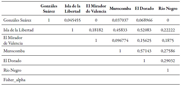 El índice de Jaccard, efectuado a las seis localidadesdel área de estudio, presenta la interacción de ElDorado y Murocomba con 0,57143 × 100 % comola de mayor similitud de especies (tabla 2).