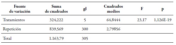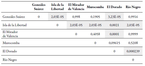 La prueba de separación de medias de Tukey (tabla 4) expone diferencias significativas entre las localidades El Dorado y Gonzáles Suárez (p = 3,23E-05).