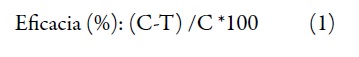 Se determinó la eficacia de cada tratamiento por parcela a los tres y siete días después de cada aplicación, para lo cual se empleó la fórmula de Abbott (Püntener & Zahner, 1981):