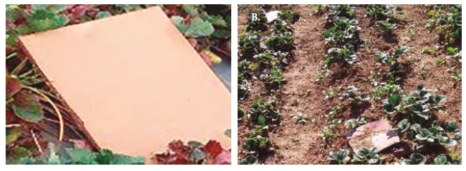 Para cuantificar la población de los moluscos, se colocaron cinco trampas por cada réplica (parcela) para un total de 20 trampas/refugios por tratamiento, las cuales se elaboraron manualmente a partir de cajas de cartón de 25 mm de espesor. Cada trampa consistió en un cuadrado de este material, de 25 × 25 cm, sujetadas con una cabilla metálica de 0,30 cm de diámetro y 40 cm de longitud, en forma de “L”, para evitar posibles desplazamientos por el viento o por los animales en el cultivo de fresa (figura 1). Con este diseño, se pretendió crear debajo de cada trampa un ambiente fresco, húmedo y adecuado para las babosas; las trampas se etiquetaron y se colocaron aleatoriamente sobre el suelo de cada parcela.
