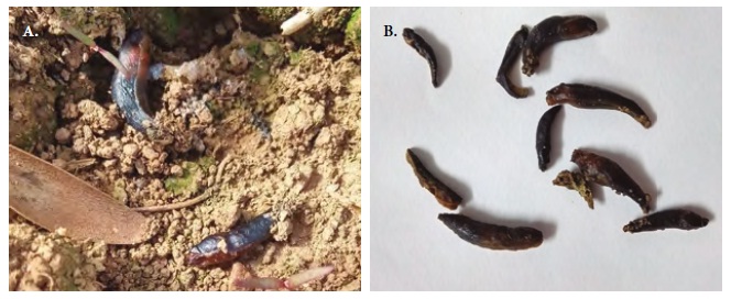 A los tres días después de las aplicaciones, todos los tratamientos mostraron mortalidad de las babosas. Los ejemplares muertos se presentaban disecados sobre el suelo (figura 3a), tanto dentro como fuera de la trampa. La afectación de los moluscos tanto por la acción de la td como por la cal impidió contar los ejemplares muertos por especies, incluso en el laboratorio, debido a la coloración oscura casi negra que adquirían (figura 3b).
