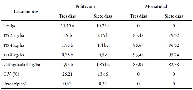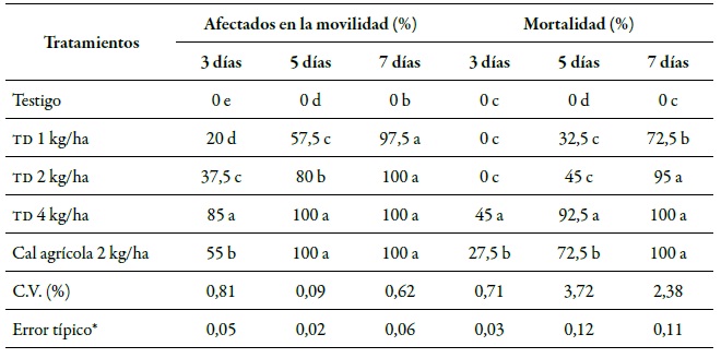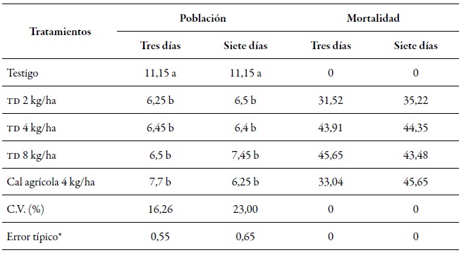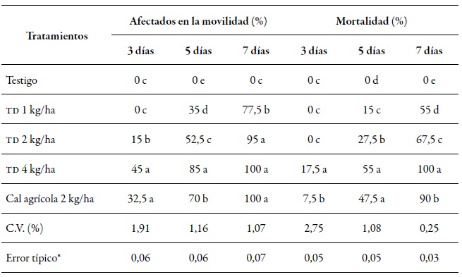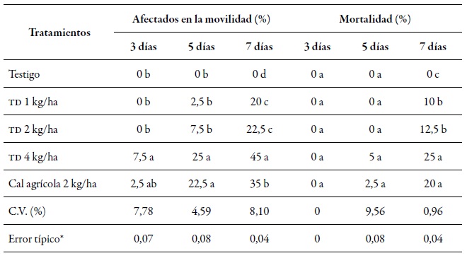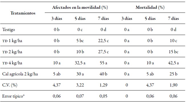 Todos los tratamientos mostraron diferencias significativas con respecto al testigo, pero los que mayor mortalidad ofrecieron fueron td a 4 kg/ha, cal agrícola a 2 kg/ha y td a 2 kg/ha (tabla 3).