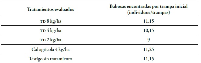 Los muestreos realizados antes de iniciar el ensayo arrojaron poblaciones de babosas entre 9 y 11,25 individuos/trampas (ind./trampas), sin diferencia estadística entre las parcelas donde se iban a realizar los tratamientos, por lo que se inició con una población uniforme (tabla 3).
