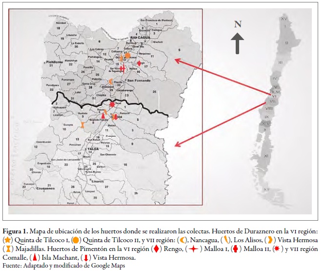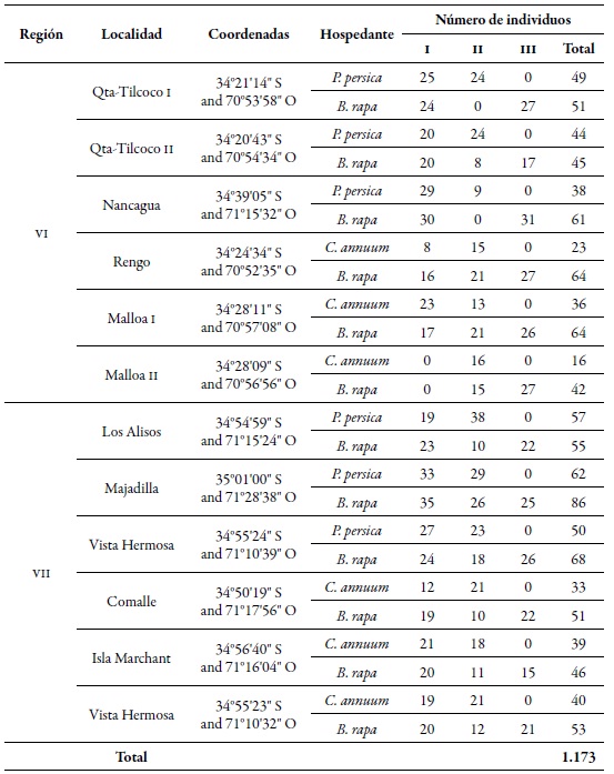 El trabajo se realizó en las regiones de O'Higgins (VI) y del Maule (VII), en Chile central; en cada una de estas regiones se seleccionaron seis huertos: tres de duraznero y tres con cultivos de pimentón, bajo un sistema de manejo de plagas convencional (aplicación regular de insecticidas). La distancia más cercana de los huertos entre regiones fue entre Comalle, de la región del Maule, y Nancagua, de la región de O'Higgins, separadas aproximadamente por 21 km. Los huertos de Majadilla, en la región del Maule, y Qta- Tilcoco II, en la región O'Higgins, fueron los más distanciados entre sí, con 90 km entre ellos aproximadamente (figura 1). En cada sitio se tomaron muestras al azar en 20 puntos; en cada punto, se colectaron cinco individuos ápteros o alados del pulgón verde del duraznero en tres momentos de muestreo: primavera (I), verano-otoño (II) e invierno (III), durante la temporada agrícola 20102011 (tabla 1). Además, se colectó el mismo número de individuos en Brassica rapa L. (Brassicaceae), asociada en cada uno de los huertos. Las muestras se conservaron en alcohol al 90 %, y los individuos fueron identificados mediante la clave para M. persicae descrita por Blackman y Eastop (2007).