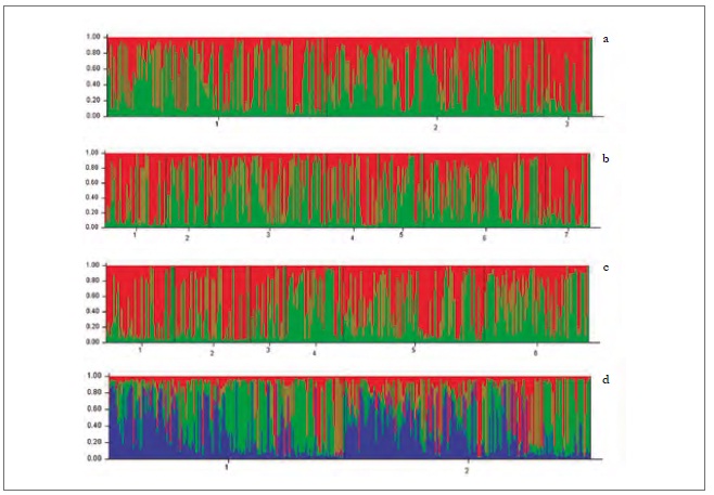 En el análisis de diferenciación genética por pares de poblaciones, considerando regiones y hospedantes, se encontraron algunas diferencias significativas (tabla 7). Es así como las poblaciones colectadas sobre duraznero en las dos regiones (D-VI y D-VII) y sobre pimentón de la región de O'Higgins (P-VI) mostraron una diferenciación genética por pares (fst) significativa con respecto a poblaciones colectadas sobre las arvenses (M-VI y M-VII) de las dos regiones (tabla 7). Además, el fst entre las poblaciones colectadas sobre durazno en la región del Maule (D-VII) también fue significativo, comparado con las poblaciones colectadas sobre pimentón (P-VI) de la región de O'Higgins (tabla 7). El análisis bayesiano de la estructuración genética de las poblaciones reveló que, cuando se consideraron las variables momentos de muestreo, hospedante/región y hospedante/momentos de muestreo, la mejor partición del conjunto de datos fue de dos grupos genéticos (K = 2) (figuras 2a, b, c); sin embargo, cuando los datos se analizaron según las regiones se encontraron tres grupos genéticos (K = 3) (figura 2d).