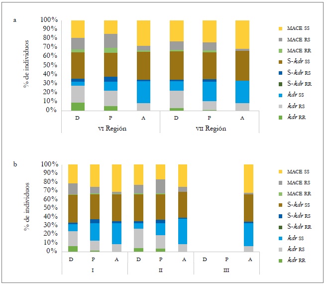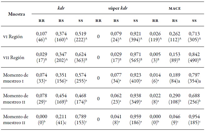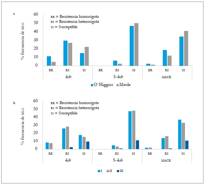 En las dos regiones estuvieron presentes los tres mecanismos de resistencia evaluados (kdr, súper kdr y mace). En la región de O'Higgins, los tres mecanismos tuvieron frecuencias levemente superiores a las de la región del Maule (tabla 8), destacándose kdr con 10,9 % de homocigotos (rr) y 29,4 % de heterocigotos (rs). La mutación súper kdr solamente se presentó en forma rs en un 6 % del total de los mlg identificados y, en el caso de mace, fue un 2,2 % rr y 18,5 % rs (figura 3A). A nivel espacial, los mlg de la región de O'Higgins tienden a presentar mayor frecuencia de genotipos con resistencia heterocigota en los tres mecanismos evaluados y resistencia homocigota en kdr y mace que en la región del Maule (figura 3a, tabla 8); mientras que en primavera (I) y verano-otoño (II), las frecuencias de los mlg y los diferentes mecanismos de resistencia fueron similares en forma homocigota (rr), siendo estadísticamente diferentes a las frecuencias en invierno (III).