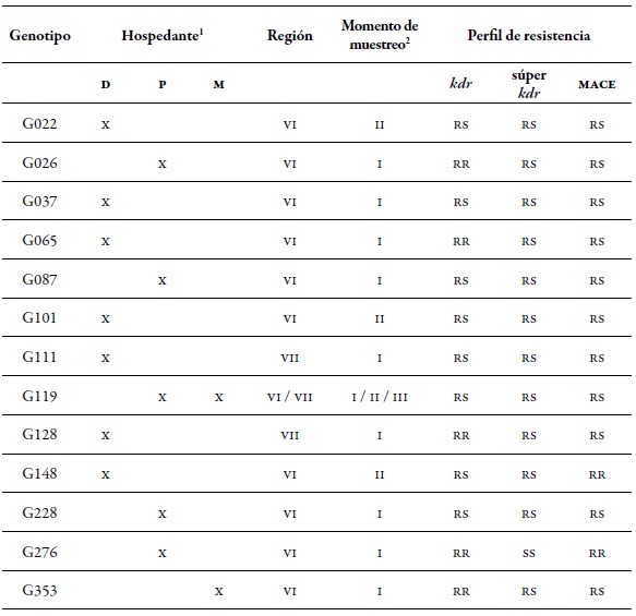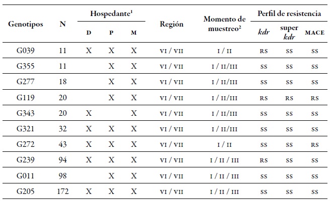 Un conjunto de 13 mlg fueron considerados importantes debido a la combinación de mecanismos de resistencia que presentaron (tabla 9). Entre ellos se destacó el G119, ya que fue encontrado en las dos regiones, en los tres momentos de muestreo y sobre hospedantes secundarios (pimentón y B. rapa) en forma heterocigota (rs) para los tres mecanismos de resistencia evaluados. Este mismo genotipo fue destacado entre los 10 mlg más comunes (tabla 4). Otro genotipo que es importante destacar por su nivel de resistencia es G276, que fue homocigoto resistente (rr) en kdr y mace, aunque fue colectado únicamente sobre pimentón en primavera. Los genotipos G26, G65, G128 y G353 fueron rr, rs y rs en kdr, súper kdr y mace, respectivamente (Tabla 9).