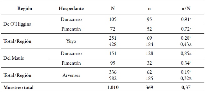 Letras minúsculas diferentes indican diferencias significativas según la prueba de χ2 en comparación múltiple de Marascuilo entre todas las proporciones. Letras mayúsculas diferentes indican diferencias significativas según la prueba de χ2 en comparación múltiple de Marascuilo entre las proporciones totales regionales.