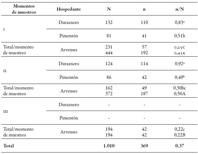 1 Hospedantes: Durazno (D), Pimentón (P), y Arvenses (M). 2 Momentos de muestreo: primavera (I), verano-otoño (II), e invierno (III).