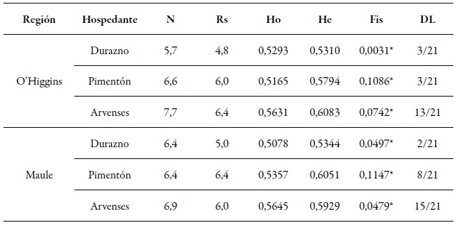 Del total de individuos analizados, se encontraron 368 genotipos multilocus (mlg). A nivel espacial, la diversidad genética gruesa (dgg) fue estadísticamente superior en la región de O'Higgins (0,43) que en la región del Maule (0,32) (tabla 2). Estos resultados son consistentes a los informados por Rubiano-Rodríguez et al. (2014), quienes evaluaron la diversidad genética a nivel de huerto en las mismas regiones de colecta. A nivel temporal, la dgg de los periodos I y II (0,43 y 0,50, respectivamente) fue mayor que la del periodo III (tablas 2-3). La DGG de P. persicae fue estadísticamente superior en su hospedante primario, tanto espacial como temporalmente a la de los otros dos hospedantes (tablas 2-3), lo que se puede explicar de dos maneras. En primer lugar, este fenómeno pudiera estar relacionado con el ciclo reproductivo holocíclico-heteroico del pulgón verde del duraznero, en el que a inicios de la primavera se congregan individuos que provienen de diferentes orígenes, tales como la eclosión de fundatrices, migración de algunos mlg que pasaron el invierno en hospedantes secundarios y el regreso de las hembras virginóparas que darán origen a las hembras ovíparas ápteras para la reproducción sexual (Blackman & Eastop, 2007). Es por eso que, al presentarse la reproducción sexual, existe mayor flujo genético, dando como resultado mayor presencia de genotipos diferentes sobre el duraznero.