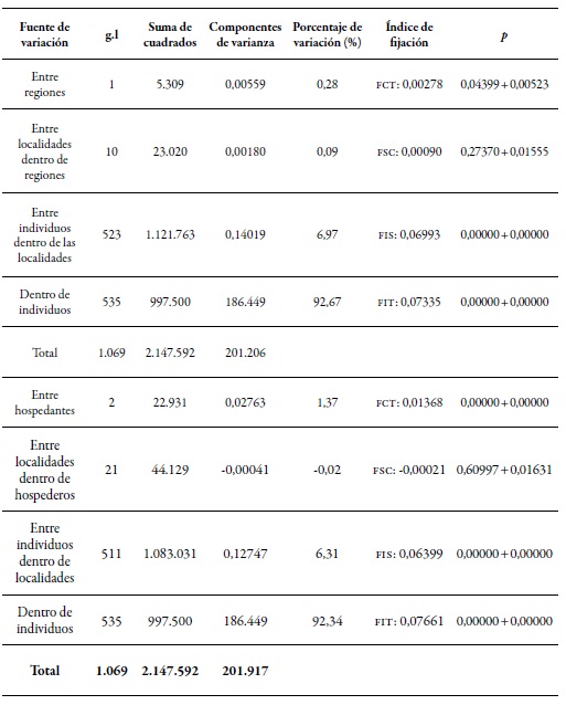 Los resultados del Amova entre regiones mostraron que hay diferenciación genética significativa (0,28%) entre las dos regiones evaluadas (tabla 6), pero no hay diferencias genéticas significativas de las poblaciones, entre las localidades de la misma región. Sin embargo, sí se encontró diferenciación genética significativa de los individuos dentro de las localidades (6,97 %), mientras que la mayor variación genética se encontró dentro de los individuos (92,67 %). Los resultados del Amova, cuando los hospedantes fueron considerados como el componente principal del análisis (tabla 6), indicaron un bajo pero significativo porcentaje de variación genética entre hospedantes (1,37 %). Cuando se analiza la contribución de las localidades teniendo en cuenta el mismo hospedante, el porcentaje de variación en este nivel no fue estadísticamente significativo. Se observó un porcentaje de diferenciación genética (6,31 %) altamente significativa entre individuos dentro de las localidades, y la mayor variación genética se sigue presentando dentro de los individuos (92,34 %). Según los resultados obtenidos durante el estudio, la variación genética entre las poblaciones de M. persicae que se presenta en Chile está más determinada por la especie de la planta (hospedante) y no por el lugar o la distancia geográfica que pueda existir entre los sitios de colectas.