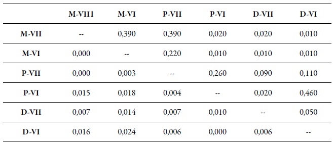 1 Durazno (D) y Pimentón (P), Arvenses (M), Región de O'Higgins (VI) y Región del Maule (VII). Los valores FST se muestran bajo la diagonal. Los valores de probabilidad basados en 999 permutaciones se muestran sobre la diagonal.