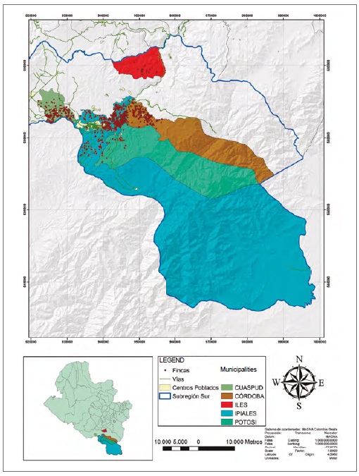 This study was carried out between February and April 2017 in the Obando or southern subregion of the department of Nariño, Colombia. A heterogeneous sample of 1,067 farms was selected in the municipalities of Ipiales (633), Córdoba (199), Cuaspud (194), Potosí (27) and Iles (14); these were chosen as they are the leading pea-producing municipalities at the departmental level.