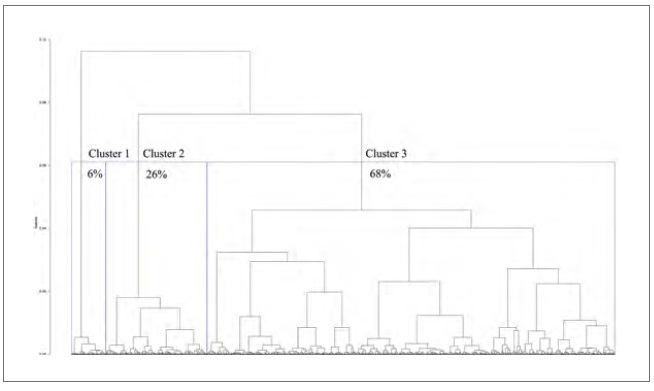 The individual contribution of the total variability factors and the eigenvalues resulting from the mca established nine factors, which accounted for 65.4 % of the data. The resulting dendrogram expressed the association of farms in three differentiated groups at a linkage distance of 0.05 units (figure 2); in addition, the suggestions of Madry et al. (2013) and Álvarez, Paas, Descheemaeker, Tittonell and Groot (2014), indicating that working with 3 to 4 clusters improves the accuracy of the resulting information was followed.