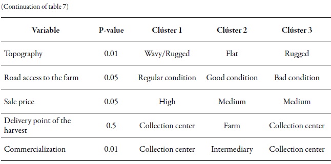The third cluster included most of the farms evaluated in the sample, i.e., 68 %. The features shown in table 7 describe the cases with smaller property sizes, characterized by being in marginal areas of the region where the access roads are difficult to transit and, comparatively, are further away from urban centers and basic commercial exchange services.