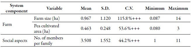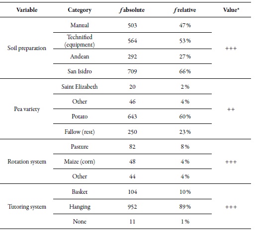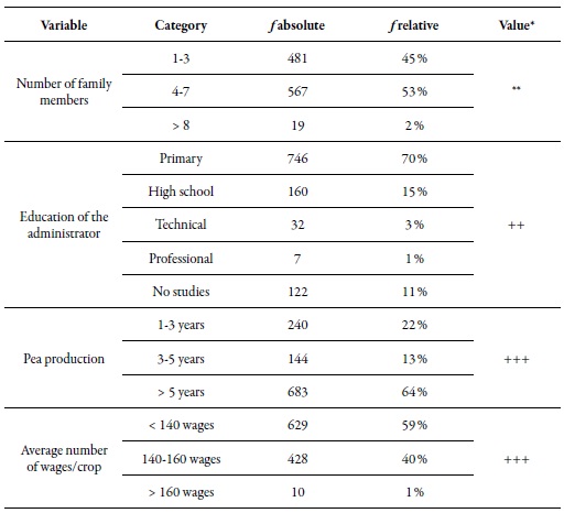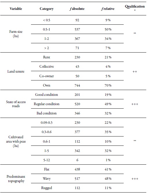 In tables 2 to 6 are shown the results of the variables that were selected for their high and medium discriminant power in each system component, information that allowed describing the background situation of pea production at the farm level in the southern subregion, showing productive and socioeconomic heterogeneity, even though the study focused on a single crop.