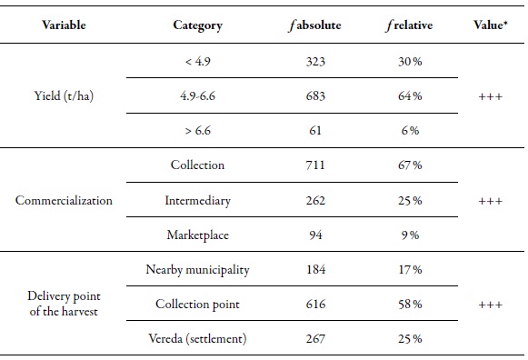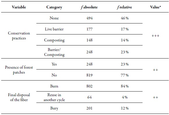 In table 1 are shown three quantitative variables that had a coefficient of variation higher than 40 %; the variables altitude (m a.s.l.) and several production plots were discarded, given that these did not show a reasonable variance within the farm samples surveyed.