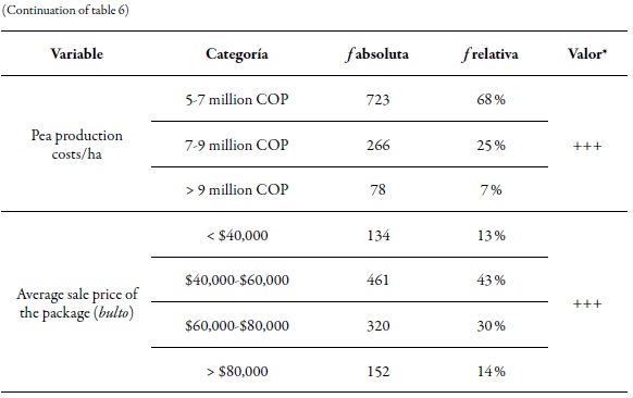 Besides, as indicated in table 6, the production cost extrapolated to one hectare of peas on average ranged between 5 and 9 million pesos per agricultural season, with substantial variations depending on the indebtedness capacity of the farmer, the environmental conditions and the distance to the commercialization point. Furthermore, this study drew attention to the fact that due to the excessive application of inputs as a productive strategy, in 7 % of the cases the production costs exceeded the amount of 9 million pesos, which was defined as a reference value, with reports of up to 11.6 million pesos for each hectare of pea. This is another determining factor when generating the clusters in the next stage of the research.
