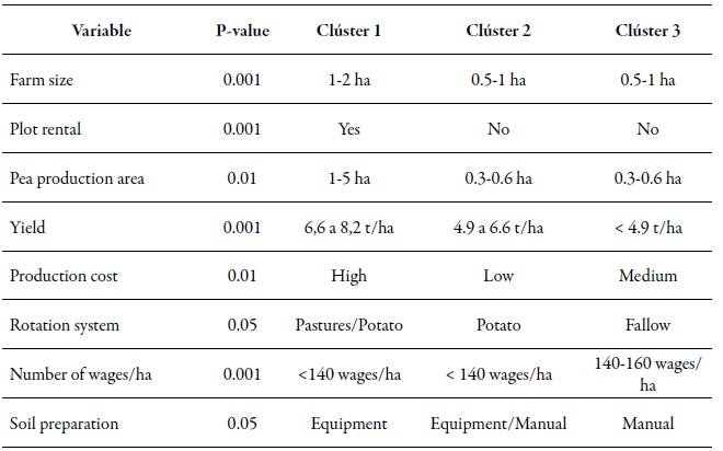 On the farms assessed, the area destined for pea cultivation was variable, with reports ranging from 0.08 ha to 12 ha as indicated in table 2, a condition that was not only related to the size of the farm, but also to the practice of renting plots for agricultural production, which is later evidenced when clusters were generated.