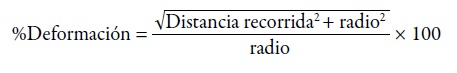 Las propiedades texturales de las tortillas elaboradas con las diferentes masas se determinaron mediante la prueba de punción, de acuerdo con el método descrito por Sobral, Menegalli, Hubinger y Roques (2001). La tortilla fue fijada en una celda de acrílico con una cámara de 52,4 mm de diámetro y perforada en el centro con una sonda esférica de 1,27 cm de diámetro a una velocidad de 1 mm/s en el mismo texturómetro, hasta una distancia de 25 mm para su rompimiento. De las gráficas fuerza-deformación se calculó la fuerza de deformación (fuerza máxima detectada en el punto de rompimiento) y el porcentaje de deformación se calculó utilizando, por una parte, la distancia recorrida por la sonda hasta el punto de rompimiento y, por otra, el radio de la cámara de la celda como valores de los catetos del teorema de Pitágoras. Para determinar la capacidad de deformación de las tortillas, se calculó el porcentaje de deformación (hipotenusa), llevando a cabo cinco réplicas de cada tratamiento, considerando el radio como la longitud original, con la ecuación 1: