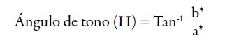 El color instrumental se determinó en coordenadas CIE-Lab, utilizando la aplicación Color Analysis para Android O.S. (Research Lab Tools, São Paulo, Brasil). Los estándares de CIE de la aplicación fueron una Iluminante de D65, que corresponde a la iluminación de luz de día, y una función del ángulo del observador de 2 °. Los resultados son el promedio de las lecturas al rotar 90 ° cada una cada una de las muestras. De los valores de CIE-Lab se calcularon el ángulo de tono (H) y el índice de saturación (S), de acuerdo con lo descrito por Little (1975), con las ecuaciones 2 y 3:
