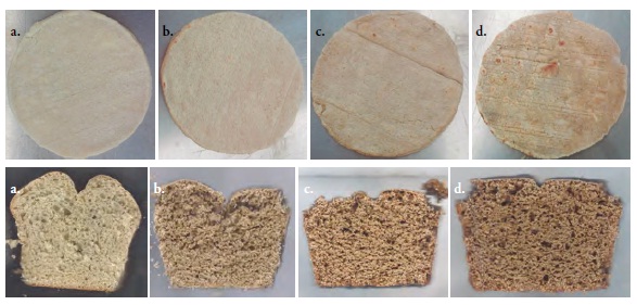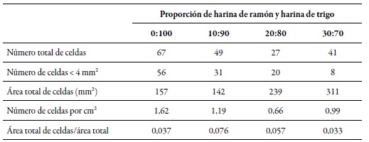 La tabla 2 muestra que la incorporación de harina de ramón modificó la estructura del pan de caja. El volumen de los panes de caja formulados con fue significativamente (p < 0,05) mayor (4,896 ± 0,257 g/mL) para la formulación control 0:100. La incorporación paulatina de harina de ramón disminuyó el volumen del pan de manera escalonada, siendo de 3,166 ± 0,123 g/mL para 10:90; 1,962 ± 0,101 g/mL para 20:80 y 1,722 ± 0,203 g/mL para 30:70. El pan de harina de trigo es un sólido suave que tiene dos fases: una fase fluida (aire entre las celdas) y una fase sólida (material de pared de las celdas). El número de celdas y su tamaño disminuyó con la incorporación de la harina de ramón, lo que explica el menor volumen y las diferencias en textura observadas. En la figura 2 se observa que la muestra sin harina de ramón tiene una fase sólida completamente conectada y homogénea.