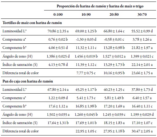 La incorporación de diferentes proporciones de harina de ramón provocó cambios en la coloración de las tortillas de maíz. Las muestras con proporción 0:100 fueron significativamente (p < 0,05) más luminosas, mientras que la incorporación gradual de harina de ramón hizo las tortillas más oscuras (valores de L* menores). Para las componentes a* y b*, coloración verde-roja y amarilla-azul, respectivamente, las muestras con proporción de 30:70 de harina de ramón tuvieron valores significativamente (p < 0,05) mayores, mientras que los valores menores de coloración verde-roja y amarilla-azul fueron para la muestra control. La incorporación de diferentes proporciones de harina de ramón aumentó la tonalidad (H) de las tortillas, ya que las muestras sin harina de ramón presentaron los valores significativamente (p < 0,05) menores. El mismo comportamiento se observó en el índice de saturación o intensidad del color (S), en el que los valores significativamente (p < 0,05) menores fueron observados en las muestras 0:100 de harina de ramón. De este modo, la mayor diferencia de color con respecto al control fue significativamente (p < 0,05) para las muestras con mayor proporción de harina de ramón, 30:70 (tabla 3).