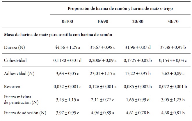 La incorporación de diferentes proporciones de harina de ramón modificó la textura de la masa y de las tortillas elaboradas. En la prueba del análisis del perfil de textura para la masa de harina de maíz nixtamalizada, el aumento en la proporción de harina de ramón disminuyó significativamente (p < 0,05) la dureza de las masas. La cohesividad de las masas fue significativamente (p < 0,05) mayor a proporciones de 10:90, y la menor cohesividad fue detectada en las masas control sin harina de ramón. Se observó el mismo comportamiento para la adhesividad y resorteo de las masas, en las que las muestras con proporciones de 10:90 fueron significativamente (p < 0,05) las más adhesivas y elásticas. En la prueba de penetración con la esfera, los valores significativamente (p < 0,05) mayores fueron para las muestras con harina de ramón, y la menor fuerza se observó en las muestras con una proporción 30:70; la fuerza de adhesión fue significativamente (p<0,05) mayor con la proporción 10:90, y la menor, en la proporción 0:100 (tabla 1).