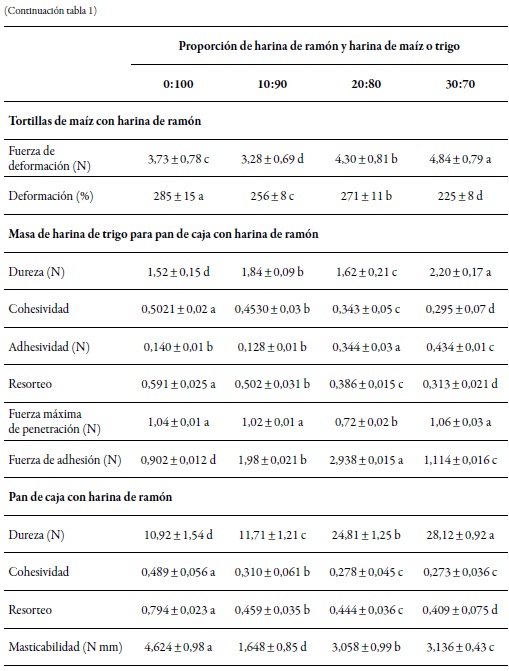 La textura de las masas para tortillas de maíz y pan de caja con diferentes proporciones de harina de ramón se determinó por pruebas de compresión y de penetración. Para la prueba de compresión, se llevó a cabo un análisis del perfil de textura de las masas crudas de las diferentes mezclas. 50 g de masa fueron moldeados en forma esférica y comprimidos con una celda de acrílico de 4 cm de diámetro, en dos ciclos consecutivos en un equipo analizador de textura Brookfield lfra 4500 (Brookfield Engineering Laboratories, Middleboro, N. J., EE. UU.). De las curvas fuerza-tiempo se determinaron los parámetros texturales de la siguiente manera: dureza (fuerza necesaria para alcanzar una deformación), cohesividad (fuerza de uniones internas que proporcionan el cuerpo a la muestra), adhesividad (trabajo necesario para superar las fuerzas atractivas entre la superficie del alimento y la superficie de otro), y resorteo (relación en la que un material deformado regresa a su condición original después de que la fuerza de deformación es removida), de acuerdo con lo reportado por Szczesniak (1963) y Bourne (1978). Para la prueba de penetración, 50 g de masa moldeada en forma de cilindro (5,0 cm de diámetro por 2,0 cm de altura, aproximadamente) fueron penetrados con una sonda esférica de 1,27 cm de diámetro, a una velocidad de 1 mm/s, hasta una profundidad de 18 mm, en el mismo texturómetro. Se calculó de las curvas fuerza-tiempo la firmeza (fuerza máxima detectada durante la penetración) y la fuerza de adhesión (fuerza máxima detectada al retirar la sonda de la muestra) (Flores-Farías et al., 2000). Todos los análisis se llevaron a cabo por quintuplicado para cada tratamiento.