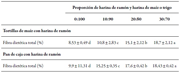 Como era de esperarse, la incorporación de harina de semilla de ramón aumentó la cantidad de fibra dietética total en las tortillas y los panes. A propor ciones de 30:70 de semilla de ramón se obtuvo el contenido de fibra significativamente (p < 0,05) mayor tanto en tortillas como en pan de caja, en contraste con el control sin harina de ramón (tabla 4).