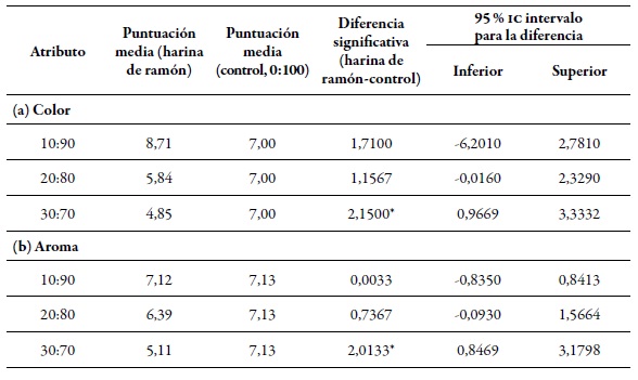 En la prueba sensorial de pan de caja se encontraron más diferencias en cuanto a la aceptación de los diferentes tratamientos. Para el color de los panes, todas las muestras tuvieron valores significativamente (p < 0,05) menores al pan control (tabla 6a). En el aroma, solo la muestras con proporción de harina de ramón 10:90 no tuvo diferencia significativa (p > 0,05) con el control (tabla 6b). Se observó el mismo comportamiento de aceptación para la textura y sabor, en la que los panes con proporciones de 20:80 y 30:70 fueron significativamente (p < 0,05) menos aceptados que los panes control. El pan con 10:90 de harina de ramón presentó calificaciones muy cercanas al control para textura (9,90 y 7,73, respectivamente) y sabor (7,30 y 7,35, respectivamente) (tablas 6c y 6d). Finalmente, la aceptación general de los panes con harina de ramón fue significativamente (p < 0,05) menor a la de los panes control (tabla 6e).