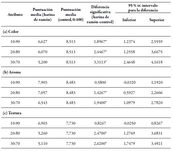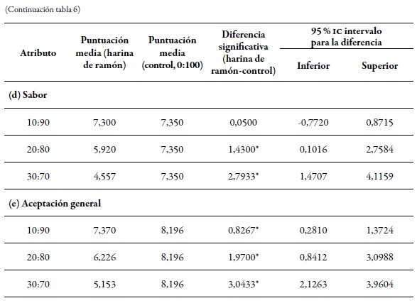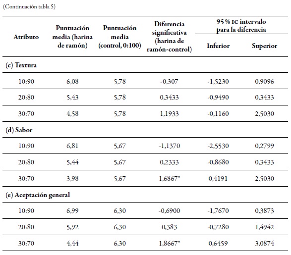 La diferencia de medias muestra que el color de las tortillas con proporciones de 10:90 y 20:80 fueron más aceptadas por los consumidores, sin diferencia significativa (p>0,05) entre estas muestras y el control. La muestra con proporción 30:70 fue menos aceptada que las muestras control con una puntuación debajo de 5 (tabla 5a). Para el aroma, no se detectó diferencia significativa (p > 0,05) entre el control y las muestras con proporciones de 10:90 y 20:80 de harina de ramón (tabla 5b). Curiosamente, la textura de las tortillas no fue significativamente (p > 0,05) diferente entre el control y ninguno de los tratamientos (tabla 5c). En cuanto al sabor de las tortillas, las muestras con mayor proporción de harina de ramón fueron significativamente (p < 0,05) diferentes (tabla 5d). Finalmente, la aceptación general de las tortillas fue significativamente (p < 0,05) menor para las muestras con mayor proporción de harina de ramón (tabla 5e), aunado a su baja calificación en color, aroma y sabor.