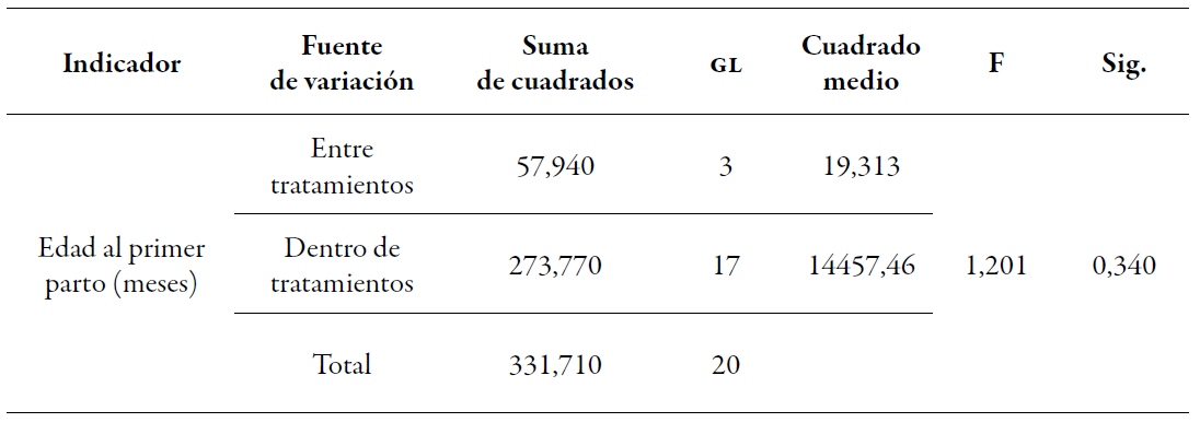 Los resultados indican que la edad al primer parto no presentó diferencias significativas entre los tratamientos (p > 0,05) (tabla 1), respuesta que sigue el mismo comportamiento para la variable derivada edad a la primera concepción.