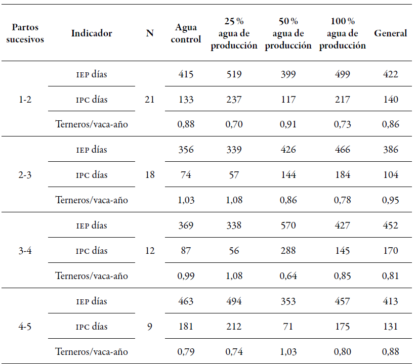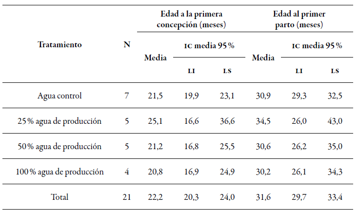 La media general para edad a la primera concepción y al primer parto fue de 22,2 y 31,6 meses, respectivamente, y entre tratamientos indican valores máximos para las dos variables de (25,1 y 34,5 meses), respectivamente. En el tratamiento de consumo de agua de producción al 25 % y valores promedios mínimos (20,8 y 30,2 meses) en el tratamiento de consumo de agua de producción al 100 % (tabla 2), tiempos menores a los 27 meses para edad promedio a la primera monta reportado por Fedegán (2012) y lo reportado para EPP por Arellano et al. (2006), Cipagauta et al. (2001), Navarrete et al. (1995) y Vergara et al. (2009). Si se asume la edad a la primera concepción de forma calculada de la revisión realizada, el resultado obtenido en este estudio para esta variable sería menor que el referenciado.