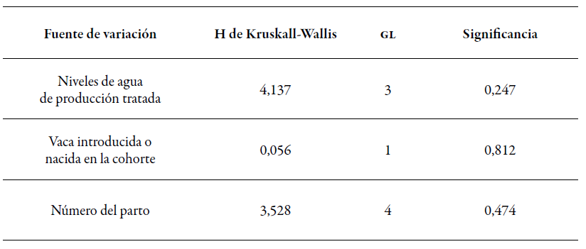 Elaboración propiaEl intervalo entre partos no presentó diferencias significativas entre tratamientos de consumo de agua de producción tratada del campo de Apiay (p> 0,05), ni entre vacas nacidas o introducidas en las cohortes ni por número del parto (tabla 3).