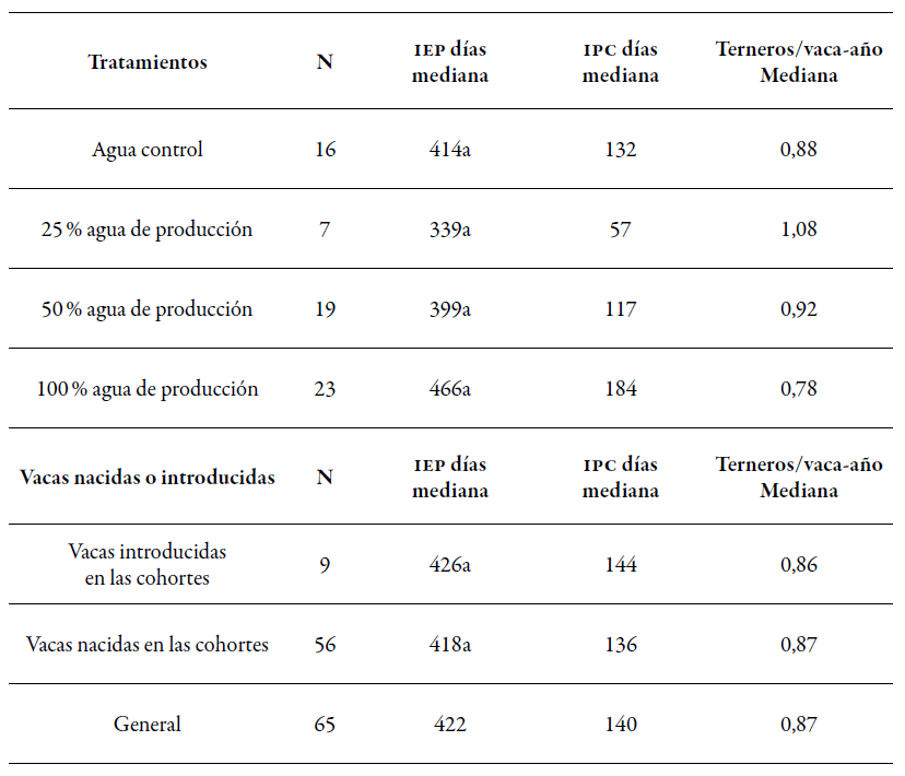 Las medianas generales del IEP, IPC y número de terneros por vaca al año fue de 422 días (14,07 meses), 140 días (4,67 meses) y 0,87 terneros (87 % natalidad), respectivamente. La respuesta obtenida entre tratamientos no mostró diferencias significativas (p > 0,05). El tratamiento con menor valor de medianas para IEP (339 días) fue el del 25 % agua de producción, respuesta que estaría entre los valores óptimos esperados en un sistema de producción bovina DP; los demás resultados fueron los tratamientos testigo, 50 % y 100 % de agua de producción con 414, 399 y 466 días, respectivamente. Estas respuestas están por debajo de los 16 meses y son comparables con los que describen Cipagauta et al. (2001) e inferiores a lo reportado por Arellano et al. (2006), López et al. (2015) y Vergara et al. (2009). El IPC señala cambios entre tratamientos que varían entre 57 y 184 días cuyo comportamiento, al ser derivado del IEP, es similar (p > 0,05). Para los tratamientos agua de control, 25 % y 50 % agua de producción, también se observan respuestas con valores de medianas por debajo de los 120 días abiertos y, para el tratamiento (100 % agua de producción), respuesta de 184 días, similar a los promedios calculados de los intervalos entre partos reportados por Cipagauta et al. (2001) e inferiores a las reportadas por Arellano et al. (2006), López et al. (2015) y Vergara et al. (2009). La variable terneros/vaca/año o tasa de natalidad señala valores de medianas entre tratamientos de 0,78 a 1,08, resultados superiores a los 0,53 que reporta Fedegán (2011) (tabla 4).