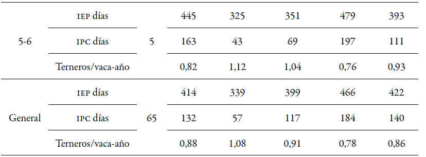 IEP: Intervalo entre partos; IEP: intervalo-parto-concepción; Terneros/vaca-año = Tasa natalidad.