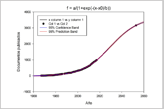 Se encontró que existen 1.016 documentos publicados en la base de datos Scopus distribuidos en artículos (967), libros (22), series de libros (22) y conferencias (5) desde 1967 y hasta el 2018. Además, las técnicas de fijación de nitrógeno se han aplicado desde 1967 con tendencia regular y su máximo uso fue en el 2017. La pertinencia de estas radica en su utilidad para analizar la eficiencia del uso del nitrógeno por los diferentes emisores y captadores en el ecosistema, como estrategia para hacer más eficientes los sistemas productivos y empresariales desde el punto de vista ambiental. Por ello, hacen parte de una tecnología que tiene un crecimiento que se ajusta a un modelo sigmoidal y cuyo punto declive se estima hacia el 2053 (R2 = 0,99; p < 0,01) por ser el punto de inflexión con mayor ajuste (R2) y cuyo valor Durbin Watson estuvo más cercano a 2; sin embargo, puede ser antes o después de dicha fecha, debido a la poca diferencia entre los valores de R2, ya que hay una complejidad en la dinámica de evolución de cualquier tecnología como resultado de la rápida madurez o el desarrollo de innovaciones (tabla 1).