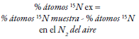 En donde E representa el porcentaje de átomos isotópicos 15N que han sido agregados en exceso (Chalk & Craswell, 2018). Esta técnica es costosa por el uso de espectrómetros de masas para la obtención de los gases y la identificación de los isómeros. Para ello, es común que se utilicen sistemas acoplados que consisten en un espectofotómetro conectado a un sistema de combustión (horno) (Hamawaki & Kantartzi, 2018). Sin embargo, como alternativa se ha optado por el uso de espectros de reflactancia hoja/dosel para identificar el isómero 15N (Thilakarathna, Moroz, & Raizada, 2017). El método se resume en la aplicación de soluciones con 1 a 10 % de exceso de átomos 15N al suelo (Braun et al., 2018; Wambeke et al., 2018) o en el fertilizante (Kg N/ha) previo a la siembra, y se estima la relación de isótopos en las plantas, en el suelo, en los microrganismos y en el aire. En plantas se cuantifica el 15N en muestras que se han secado, por ejemplo: en soya muestras de raíces, nódulos y semillas se han dejado a 70 °C por 72 horas (Hamawaki & Kantartzi, 2018). La detección del isótopo 15N es posible debido a su mayor peso (15 masa atómica) en comparación con los átomos de nitrógeno que se encuentran en la atmósfera (14 masa atómica), lo que permite que durante el proceso se separen y, posteriormente, sean colectados y cuantificados en el espectofotómetro. Para estimar el porcentaje de isótopos se puede utilizar la siguiente fórmula, en la que se tiene en cuenta el aporte de isótopos en el aire (0,3663 % átomos 15N) (Hamawaki & Kantartzi, 2018):