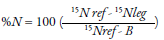 En donde B representa la abundancia de isótopos (15N) en la planta leguminosa, dependiente únicamente del proceso de fijación biológica del nitrógeno, 15N ref es la abundancia del isótopo 15N en la planta de referencia, y 15N leg es la abundancia del isótopo 15N en la leguminosa (Van Vugt, Franke, & Giller, 2018). Las muestras usadas son generalmente brotes que se secan a 65 °C durante 72 h o hasta alcanzar un peso constante. Posterior al secado se pesan, se mulen y se cuantifica el 15N en un espectrofotómetro de masas (De Carvalho et al., 2017), pero también se ha validado el uso de tejido de grano (2,5 mg), de modo que la eficiencia del nitrógeno fijado se puede estimar como kilogramo de grano producido por kilogramo de absorción de nitrógeno de brotes en la etapa de crecimiento (Polania, Poschenrieder, Rao, & Beebe, 2016). Algunas plantas fijadoras de nitrógeno tienen un valor de referencia (B): para fríjol de soya se reporta -2 ‰ (Van Vugt et al., 2018), -3,09 ‰ en brote, -2,44 ‰ en grano para los genotipos con hábito etapa de crecimiento II (Polania et al., 2016), aunque tambien se ha observado -0,80 ‰ (Van Vugt et al., 2018), y en gramíneas por lo general se usa como valor 0 (De Carvalho et al., 2017). Dichas diferencias en la misma especie ocurren porque dentro de la planta hay discriminación en la distribución de 15N en sus órganos (Polania et al., 2016). El método de abundancia natural solo funciona si el 15N de la leguminosa esta entre el valor ‘B’ y el 15N de la planta de referencia (Van Vugt et al., 2018). Además, es posible calcular la cantidad de nitrógeno acumulado por las plantas multiplicando el nitrógeno total por su biomasa, respectivamente (De Carvalho et al., 2017).