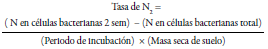 En donde las células bacterianas totales se calculan a partir de la multiplicación entre el número de colonias y la cantidad de bacterias encontradas (Das & De, 2018). Los autores indican que existe una correlación positiva entre este método y el ensayo ARA, pero también observaron que, al ser una técnica directa, la cuantificación de nitrógeno fijado es mayor en comparación con ARA, aunque aún faltan más ensayos que corroboren su sensibilidad. Otras ventajas de esta técnica son las siguientes: 1) menor costo, ya que no se utilizan equipos complejos, y 2) sirve para analizar cualquier tipo de suelo (Das & De, 2018). Sin embargo, la mayor limitante es que es una técnica demorada, ya que los resultados se obtienen después de 140 días aproximadamente, y pueden presentarse problemas de contaminación; además, es posible que no toda la masa microbiana fijadora de nitrógeno se pueda recuperar en este medio (Das & De, 2018).