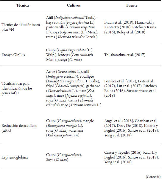 Los métodos más antiguos para verificar la eficiencia del uso del nitrógeno en los cultivos se relacionan con la estimación de la producción de materia seca y la fijación de nitrógeno en las diferentes partes de la planta. Con el tiempo, los estudios se han enfocado en el análisis específico de los agentes que intervienen en el ciclo del nitrógeno, en especial el suelo (capas de diferente profundidad), las plantas (análisis de Rhizobium, nódulos, contenido de ureidos, medición de leghemoglobina) (Sainju, 2017) y los microorganismos, debido a que el proceso de fijación está directamente relacionado con acción biológica (diazótrofos de vida libre y en simbiosis). Las principales técnicas se resumen a continuación.