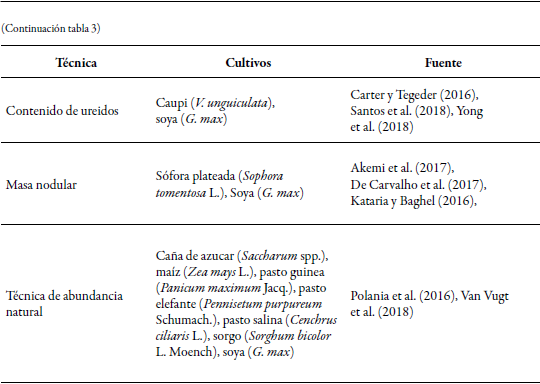 Dentro de los métodos utilizados se destacan las técnicas de última generación como identificación de genes nifH, 16S rRNA (Rampadarath, Bandhoa, Puchooa, Jeewon, & Bal, 2017); los métodos de dilución de isótopos de nitrógeno; uso de espectros de reflactancia hoja/dosel para identificar 15N, y técnicas menos precisas como diferencia del N total, balance del N en el sistema, diferencia de N total en las plantas, masa nodular, suministro de carbohidratos a la raíz, contenido de ureidos, reducción de acetileno, modificaciones del Kjeldahl (Yan et al., 2017), contenido de Leg-hemoglobina en nódulos y el ensayo GlnLux a partir de sensores que detectan glutamina (Thilakarathna & Raizada, 2018). No obstante, en campo la forma práctica de relacionar la absorción eficiente de nitrógeno es con la producción de materia seca (Mondal, Datta, & Mondal, 2017), el número de hojas/tallos (Bilal, Ayub, Tariq, Tahir, & Nadeem, 2017) y la producción de biomasa verde (Bionda, Babini, Martino, Salas, & Lajmanovich, 2018; Dutta, Datta, & Mandal, 2017).