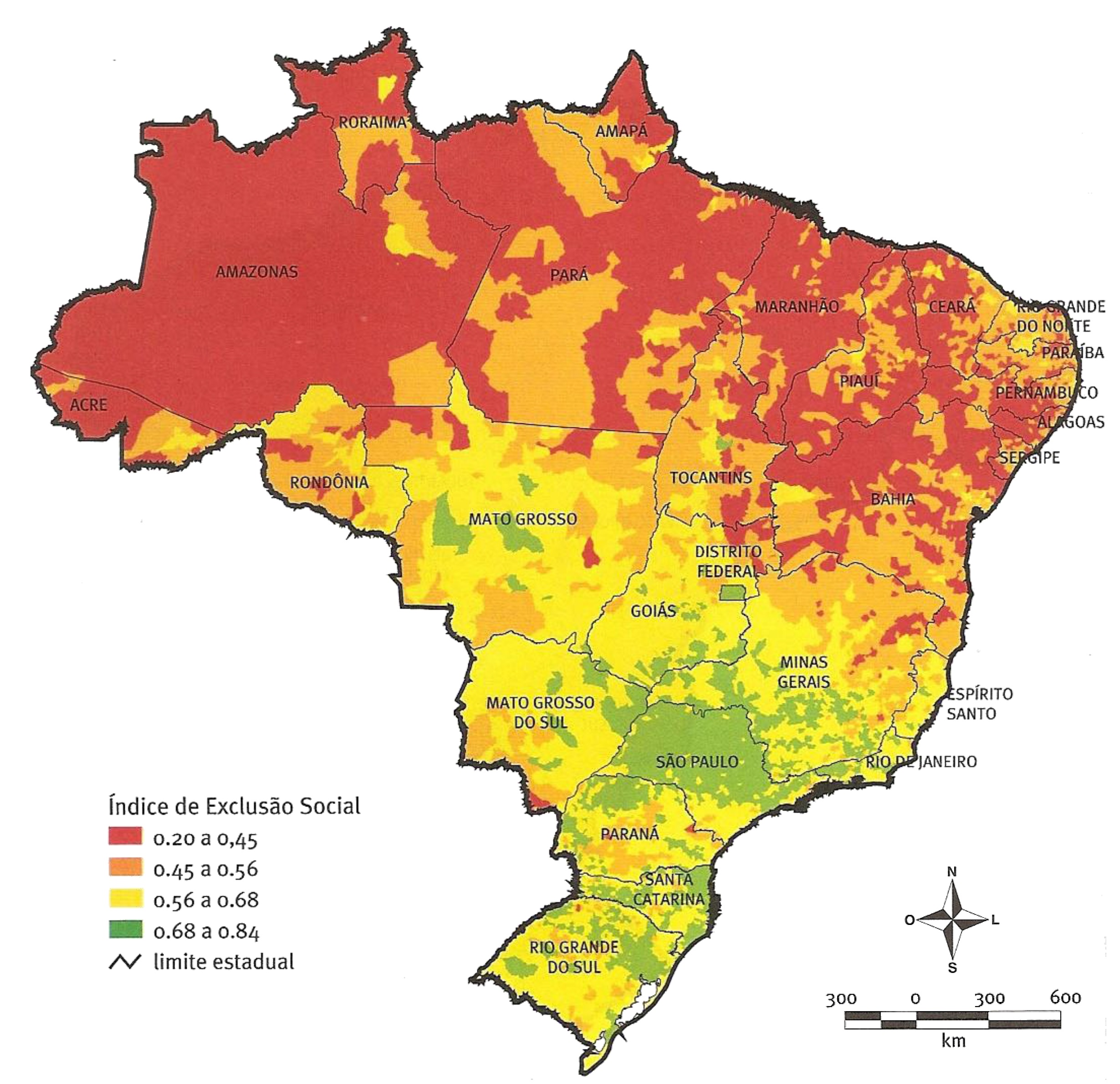 Por sua vez, a “nova” exclusão social remete, para os autores supracitados, à “manifestação de [novas] categorias de desigualdade. [...] Essa nova exclusão atinge segmentos sociais antes relativamente preservados do processo de exclusão social” (p. 32 e 49). Até meados dos anos 2000, estas “novas” manifestações de exclusão se ampliaram nas localidades socioeconomicamente mais avançadas do país – em especial, os estados das regiões Sul e Sudeste, além do Distrito Federal (Cf. Figura 1) –, materializadas por meio “do isolamento juvenil, da pobreza no interior de famílias monoparentais” atingidas pelo desemprego e a instabilidade do trabalho flexível, “da ausência de perspectiva para parcela da população com maior escolaridade e da explosão da violência” (p. 34). Nestas porções do território nacional, os índices de alfabetização e instrução atingem os níveis mais elevados do país, fruto de importantes mudanças políticas ocorridas a partir da década de 1980, como a “livre organização de sindicatos, medidas universalizantes da Constituição de 1988 e maior autonomia para execução de políticas sociais no âmbito estadual e local” (p. 47). Em contrapartida, o desemprego e o subemprego, a informalidade e os baixos rendimentos “contribuem para romper os vínculos sociais numa sociedade cada vez mais competitiva, onde existe uma sede por padrões de consumo mais sofisticados e na qual a violência desponta como sintoma máximo da dessocialização” (p. 54).
